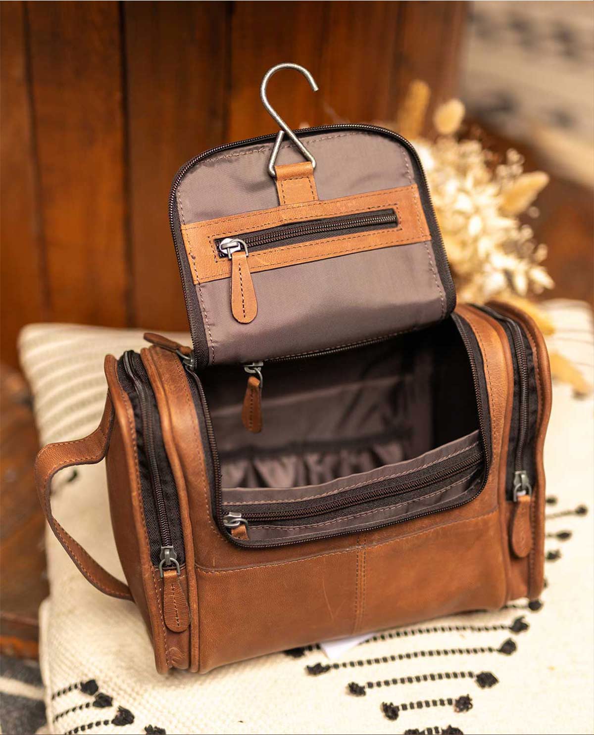 Se fossi un piccolo folletto, potresti giocare a nascondino in questa borsa da toilette. "Chester" offre incredibili possibilità per riporre ordinatamente tutti i tuoi articoli per l'igiene. Oltre alle sue versatili tasche, "Chester" convince anche con dettagli pratici: nelle due tasche laterali tutto è ben sistemato e grazie al pratico gancio puoi appendere la borsa in sicurezza in qualsiasi bagno del mondo. L'interno idrorepellente perdona anche piccoli incidenti con lo shampoo. Ispirata dal fascino urbano della grande città di Berlino, questa borsa da toilette combina funzionalità con un look elegante. Puoi scegliere tra un elegante marrone scuro e un moderno marrone chiaro – cosa si può volere di più? Con "Chester" sei sempre ben equipaggiato per i viaggi.