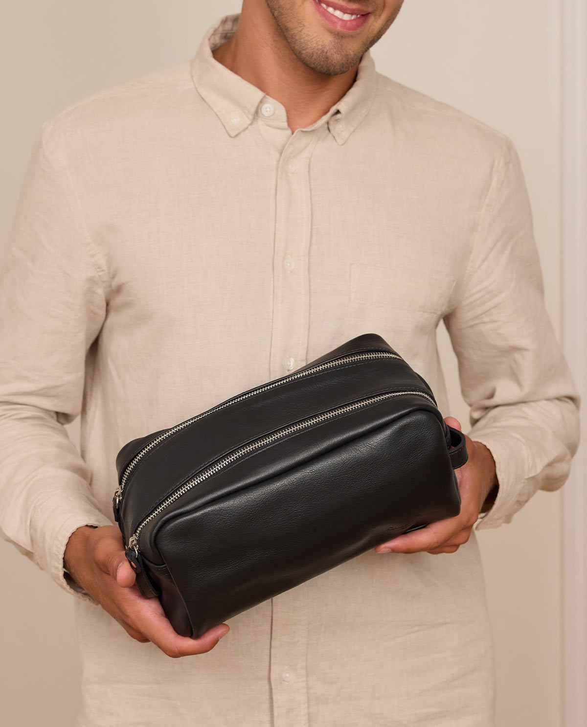 Aus hochwertig verarbeitetem und strapazierfähigem Rindsleder ist "Finja" der perfekte Ort, um deine Hygieneartikel für die Reise sicher und kompakt zu verstauen. Im Inneren ist für Deo, Shampoo, Conditioner, Zahncreme und -bürste und noch viel mehr Platz. Das Hauptfach bietet genügend Platz und durch das wasserfeste Polycotton sind kleine Unfälle mit Shampoo-Flaschen kein Problem mehr. Abgerundet wird dies mit passendem Doppelreißverschluss. Dieser ist auch praktischerweise als Henkel verwendbar. So bleibt alles beisammen und ist optimal verstaut.