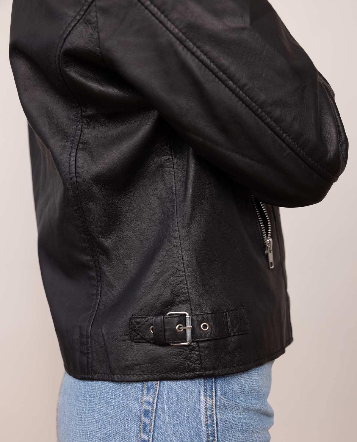 Ein Klassiker mit moderner Note – die Bikerjacke „Ova“ aus schwarzem Echtleder verleiht Deinem Outfit eine markante, stilvolle Ausstrahlung. Egal, ob Du sie mit Jeans und Boots kombinierst oder über einem Kleid trägst, diese Lederjacke setzt ein modisches Statement. Das hochwertige Leder fühlt sich angenehm weich an und entwickelt mit der Zeit eine individuelle Patina – genau so einzigartig wie Du.