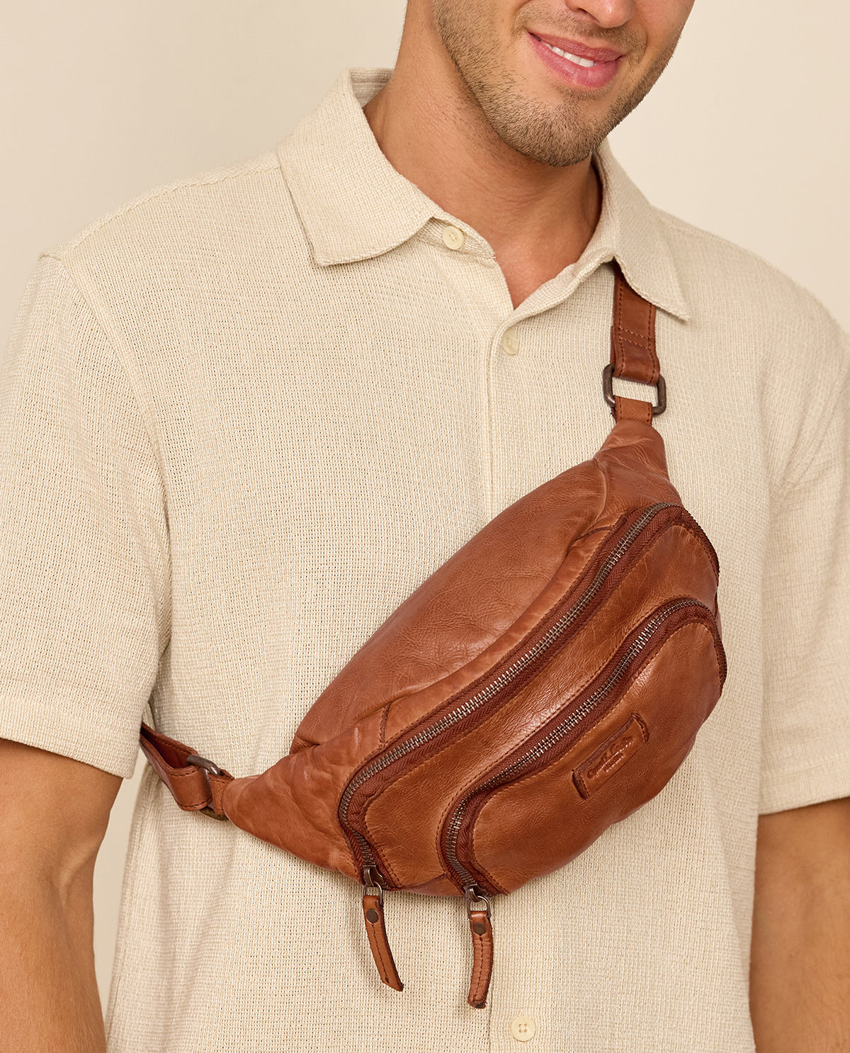 Du suchst noch eine coole Bauchtasche für die nächste Festivalsaison, eine praktische Aufbewahrungsmöglichkeit für Snacks auf der Piste oder einfach eine kleine Tasche, in der du deine Sachen beisammen halten kannst? Dann bist du bei "Sverre" auf jeden Fall richtig! Die coole Vintageoptik macht die Tasche aus robustem Rindsleder definitiv zu etwas besonderem, so siehst du immer gut gestylt aus. Im großen Hauptfach kannst du deine Habseligkeiten großzügig unterbringen. An der Vorderseite findest du noch zusätzlich zwei kleinere Taschen, die du ebenfalls mit einem Reißverschluss verschließen kannst. Das Coachella kann kommen! Aber auch im Winter macht er auf Konzerten eine gute Figur und nimmt mühelos Portemonnaie, Schlüssel und Smartphone für dich mit! So kannst du ganz gedankenlos tanzen und die Musik genießen, deine Sachen sind sicher.