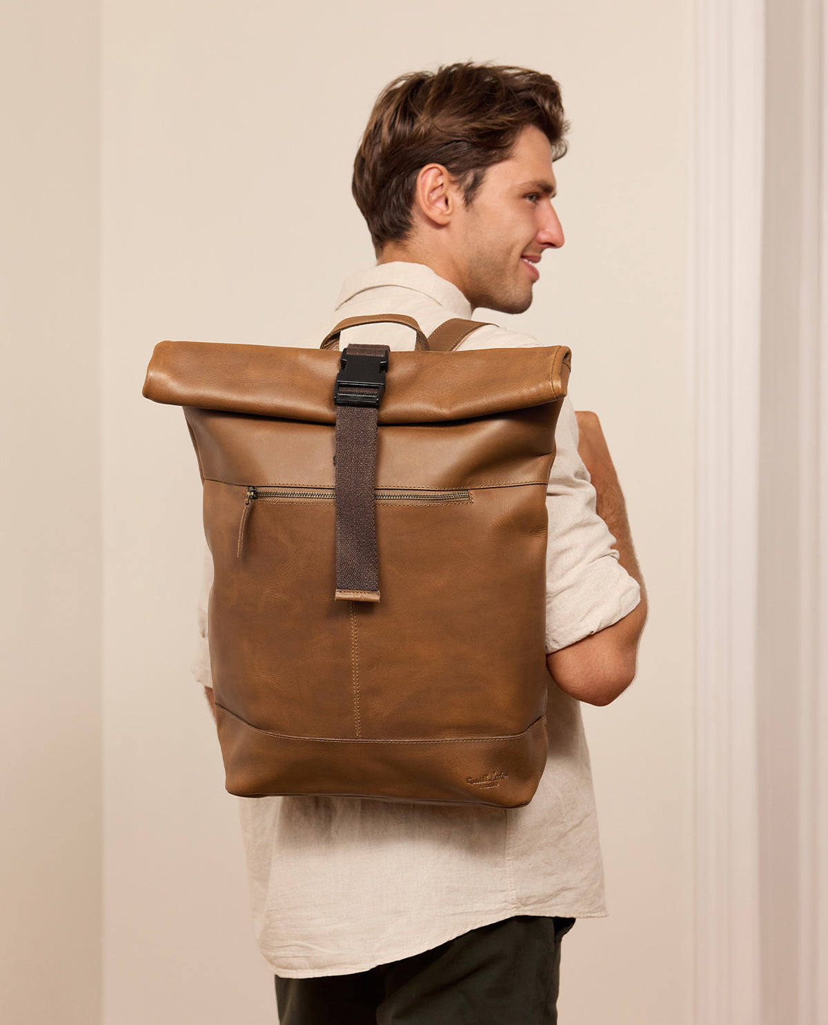 Ob für Schule, Uni oder Arbeit – unser Rolltop-Rucksack "Mattis" passt einfach immer. Denn er weiß mit seiner Flexibilität, seinem hohen Tragekomfort und Platzangebot zu überzeugen. Dieser klassisch-robuste Daypack aus braunem Büffelleder fällt dabei vor allem durch sein trendiges Rolltop auf – ein Look, an dem man momentan einfach nicht vorbeikommt.