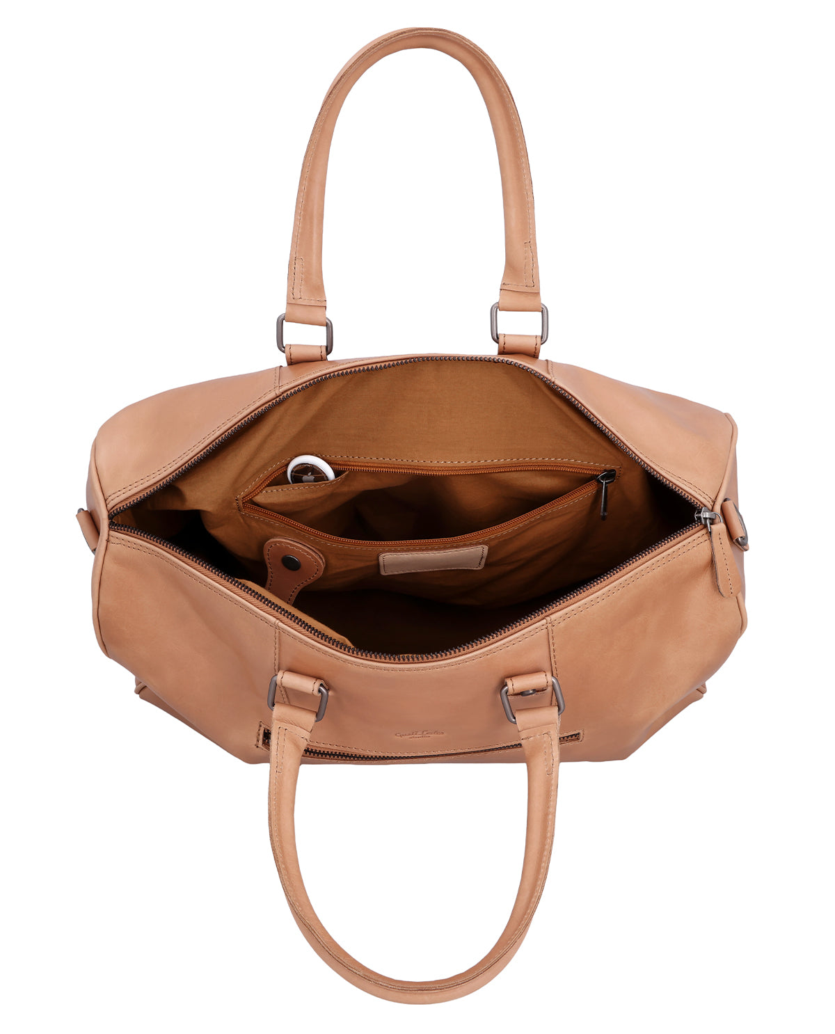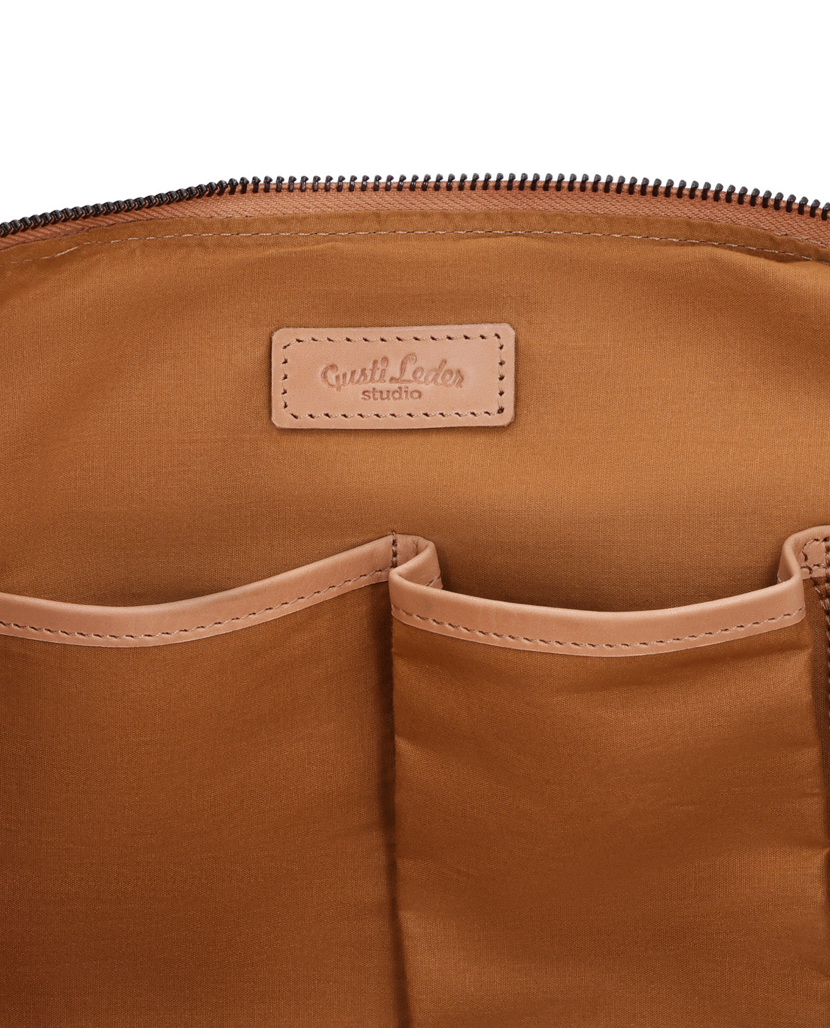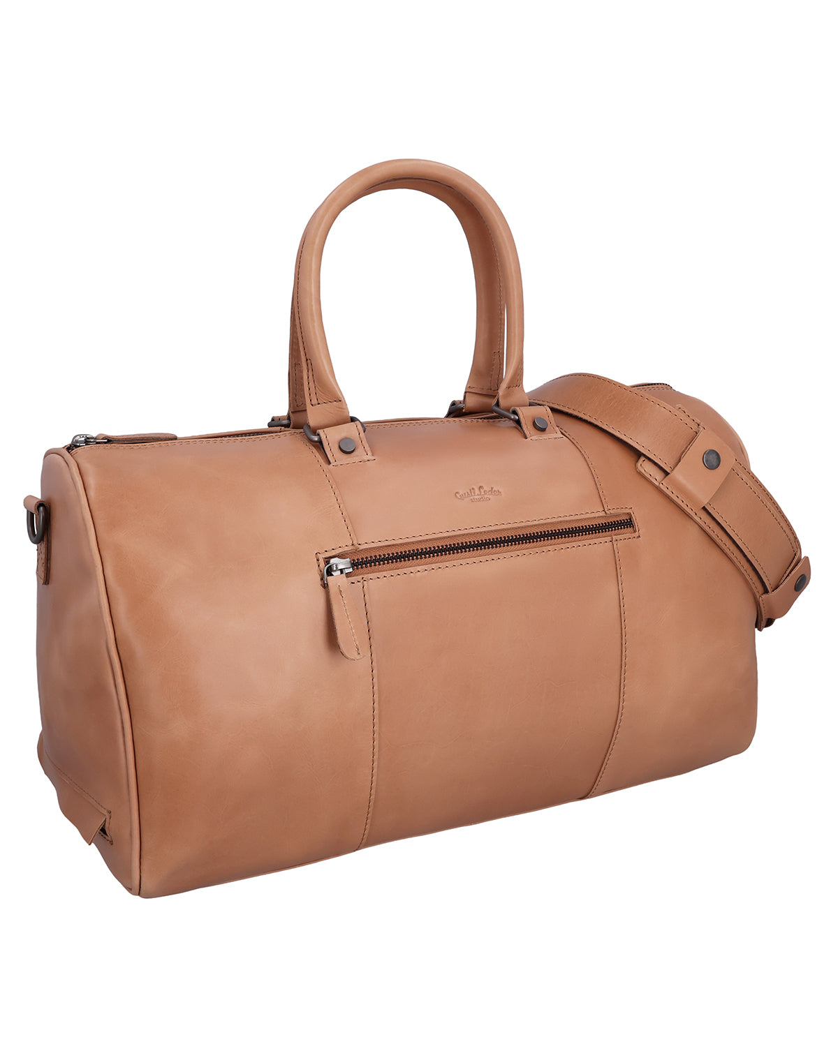 Innen und außen bietet „Joris“ mehrere Reißverschlussfächer, ergänzt durch Steckfächer und Stiftehalter für strukturierte Organisation. Der lange Schultergurt ist verstell- und abnehmbar, zusätzlich sorgt ein abnehmbares Schulterpolster für angenehmen Tragekomfort auf längeren Strecken. Ein stabiler Metallreißverschluss schließt die Tasche sicher, während ein Gravur-Patch Raum für Personalisierung bietet. Das Gusti-Logo innen und außen rundet die Lederreisetasche stimmig ab. „Joris“ ist die ideale Wahl für alle, die Funktion, Komfort und langlebiges Leder in einer Reisetasche vereint suchen.