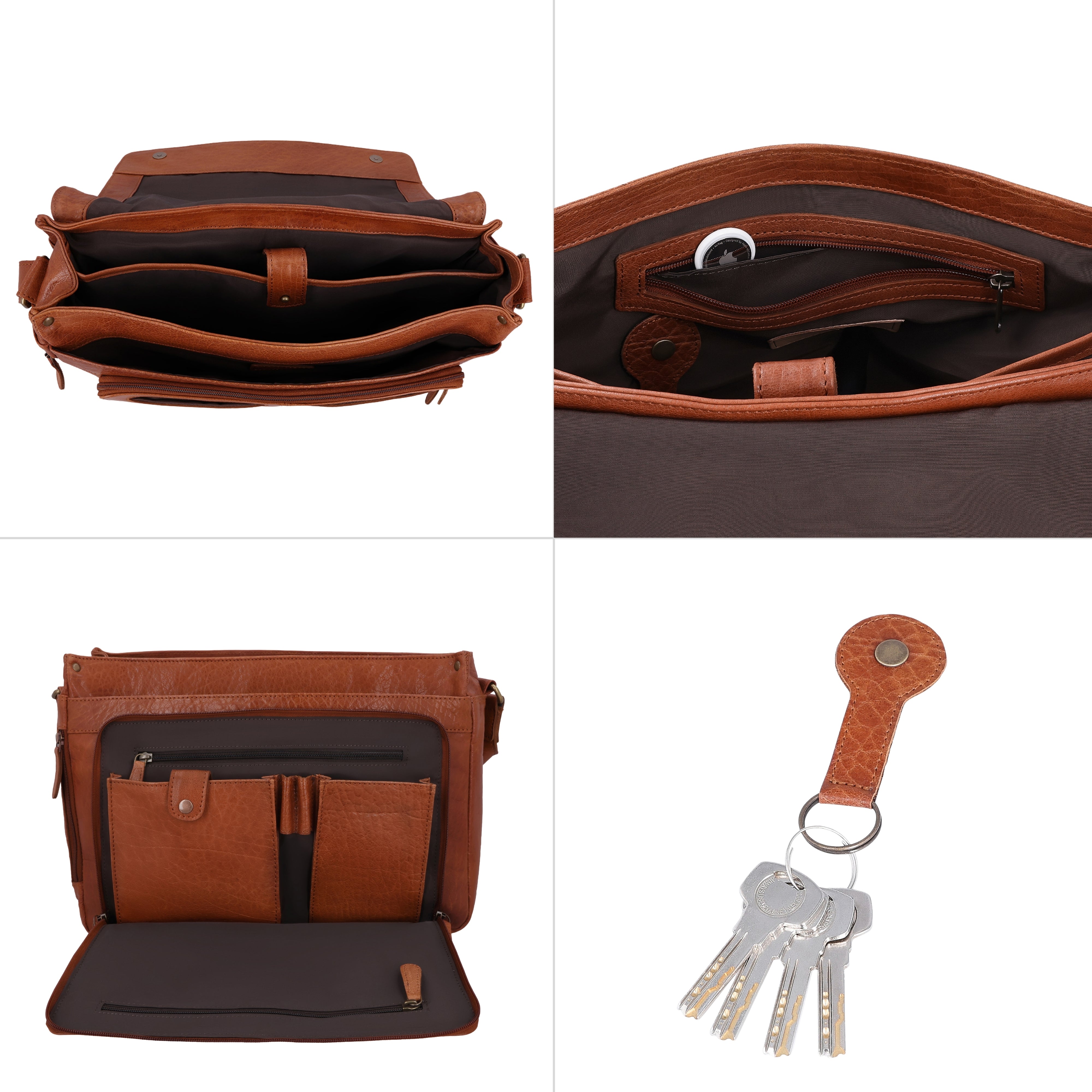 The “Florin” briefcase is a well-designed leather business bag for men and women who want flexibility in their daily lives. An integrated AirTag compartment provides extra security, while an additional strap has been specially designed to keep the bag securely against your body while cycling. This ensures that “Florin” stays reliably in place even when you’re on the move. A practical keychain helps you keep your most important essentials within easy reach, complemented by a side secret compartment with a zipper for items you want to store discreetly. This leather laptop bag combines mobility, security, and a clear structure.
