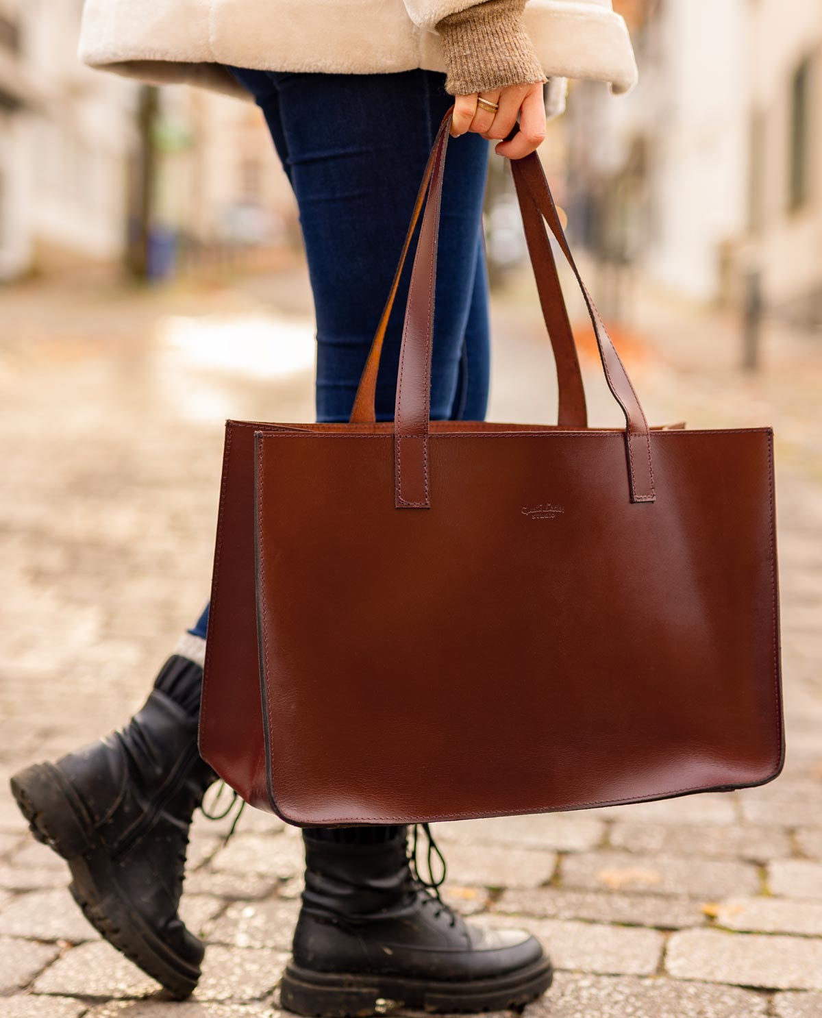 The extra-large interior of "Agatha" provides ample space for your 15-inch laptop, water bottle, wallet, notebooks, keys, and pencil case. Additionally, the large opening offers enough storage space for a spontaneous shopping trip. The leather carry handles complete the design, while the option to personalise "Agatha" with an engraving makes it a particularly unique gift. This bag not only meets the demands of your everyday life but also supports an industry committed to environmental protection and fair labor practices. A must-have for anyone who wants to combine functionality and style.