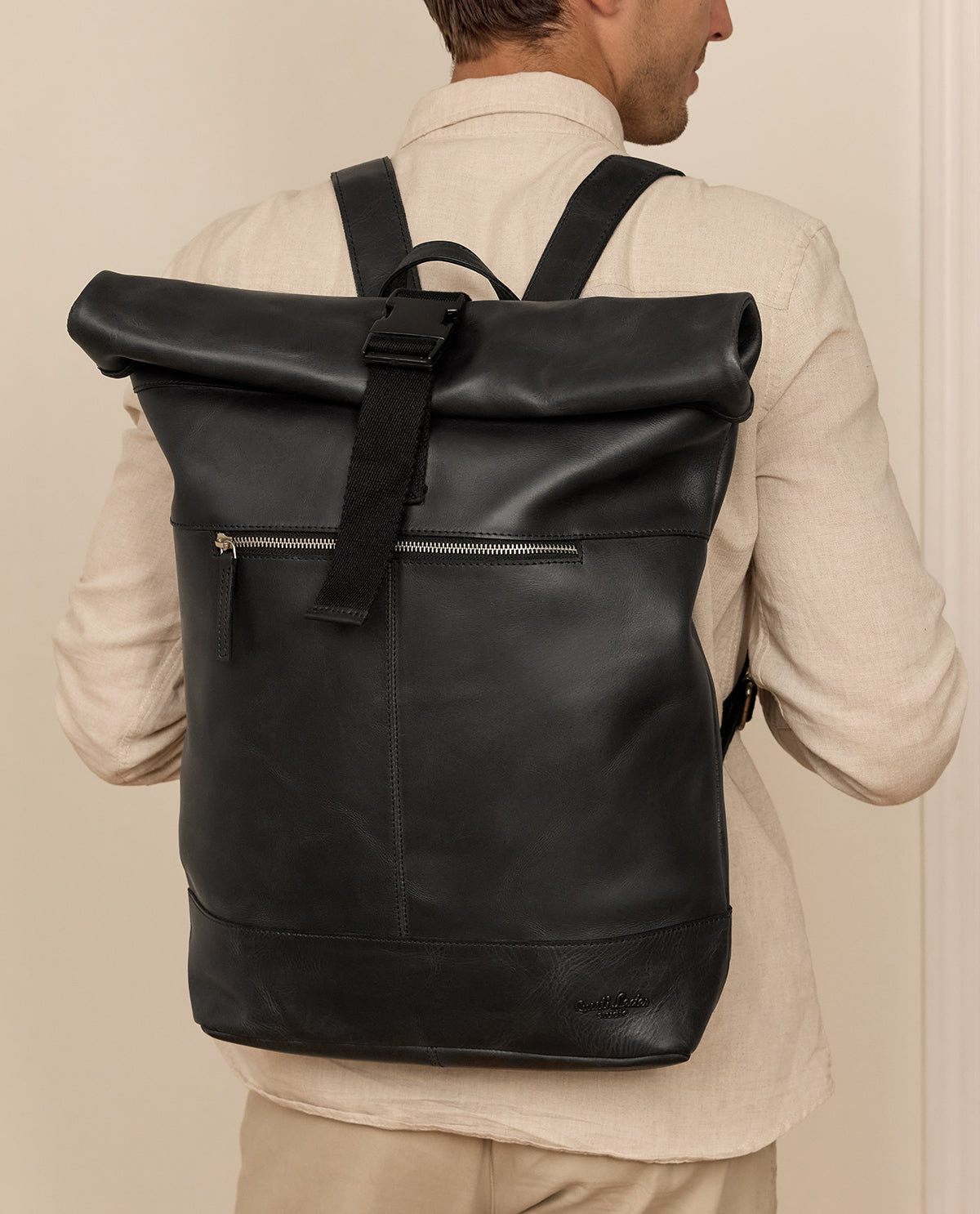 Our “Mattis” roll top backpack is the perfect companion, no matter if you’re going to school, uni or work. He’ll win you over with his versatility, comfort, and space. This sturdy classic black buffalo leather daypack stands out from the crowd with its trendy roll top - a look that you just can’t ignore at the moment.