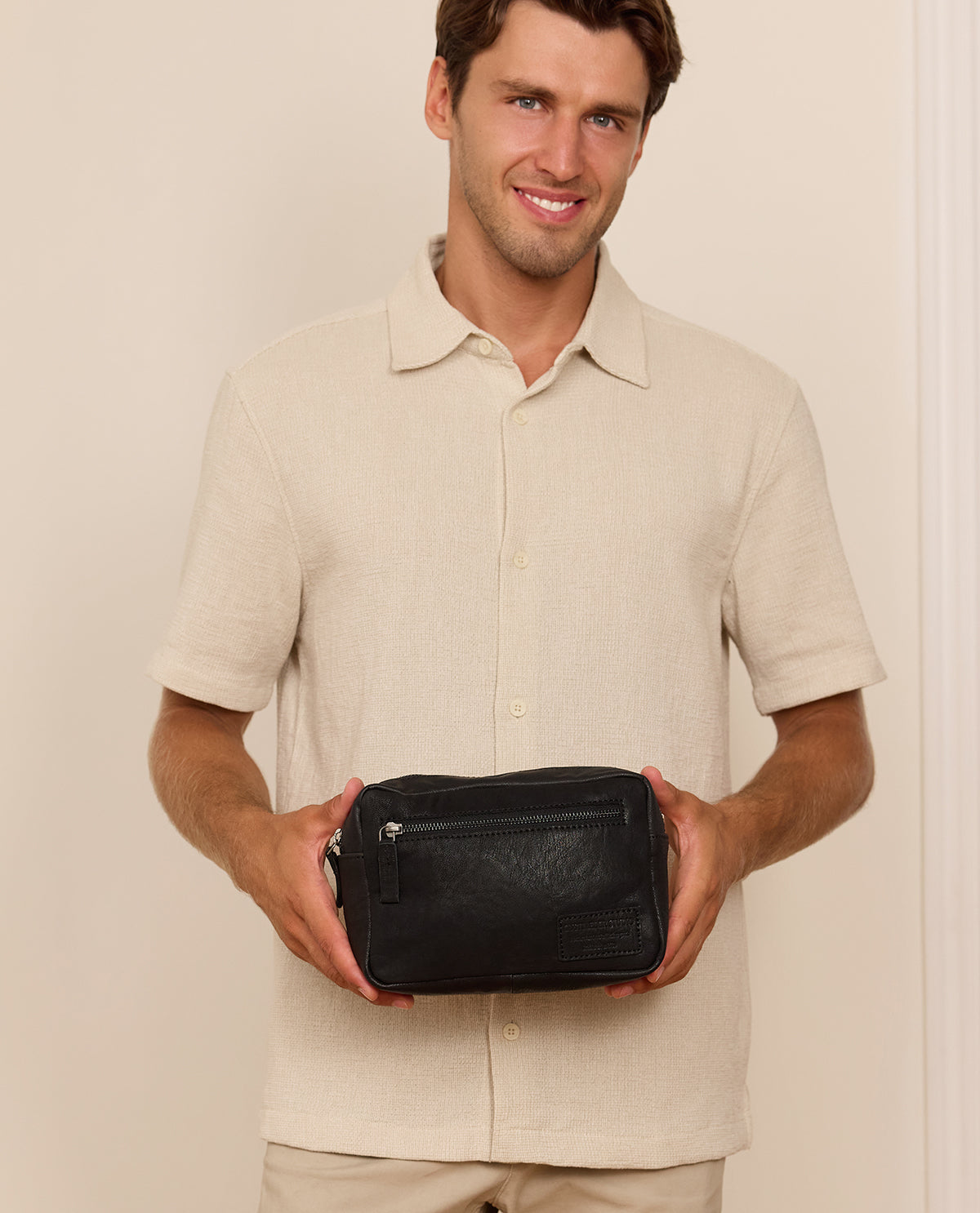 Our "Carmina" is an elegant and practical toiletry bag that keeps your beauty products safe and secure at home and on the go. Crafted from high-quality black leather, our washbag will impress you with its timeless design and durable construction. The spacious main compartment has plenty of room for your essentials, while the extra side pocket is perfect for smaller items like a razor or toothbrush. Designed for men and women, "Carmina" combines style and functionality in a compact design that fits easily into your luggage. Perfect for those who don’t want to compromise on elegance while travelling.