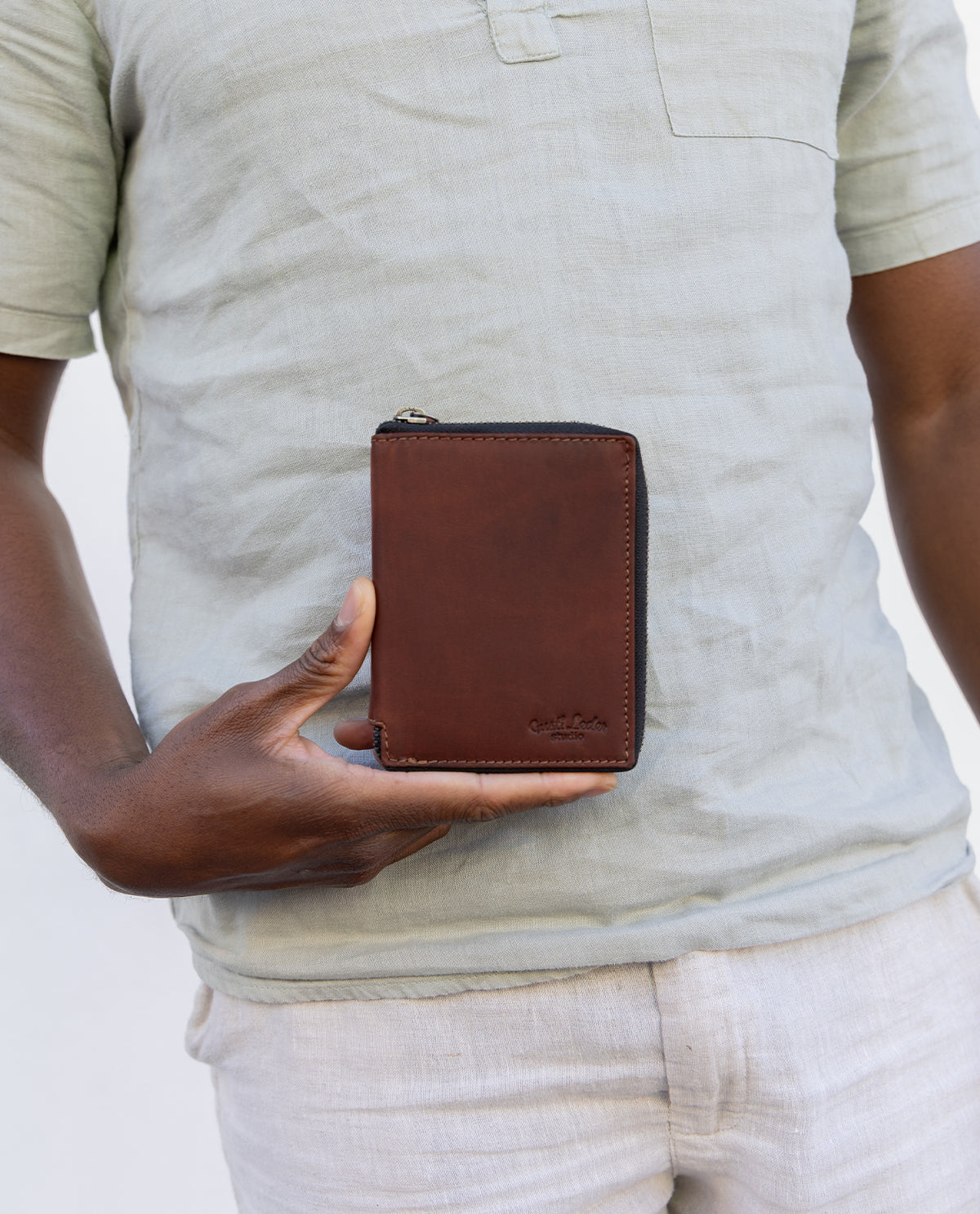 “Darian” is super organised; he has a large note pocket, a separate coin pocket secured with a press button, and three deeper slots. This high-quality tanned cowhide leather wallet will win you over with its compact size, stability, and soft feel. “Darian's” design is completed by a sleek zip. So, you won't lose anything when you're on the go.