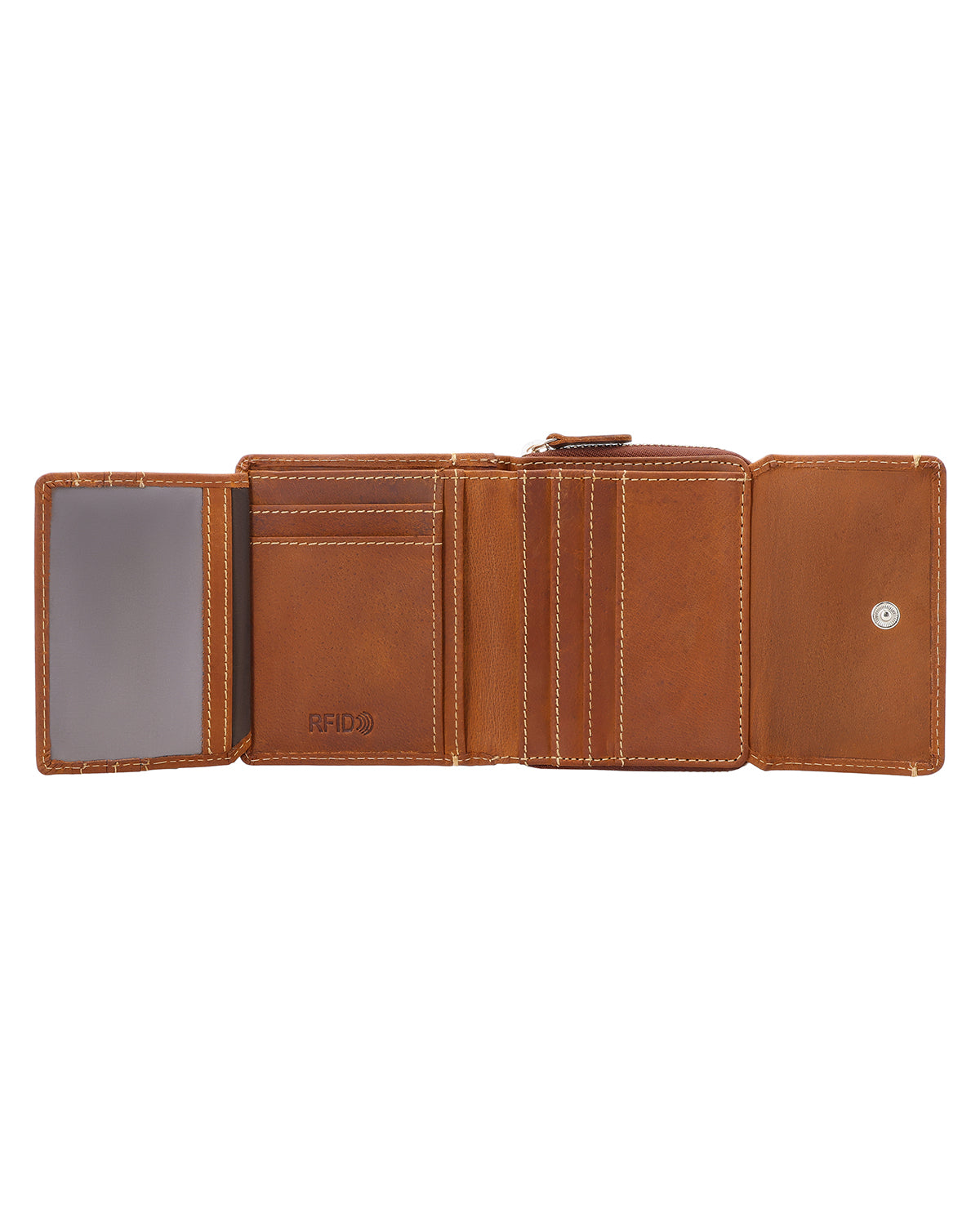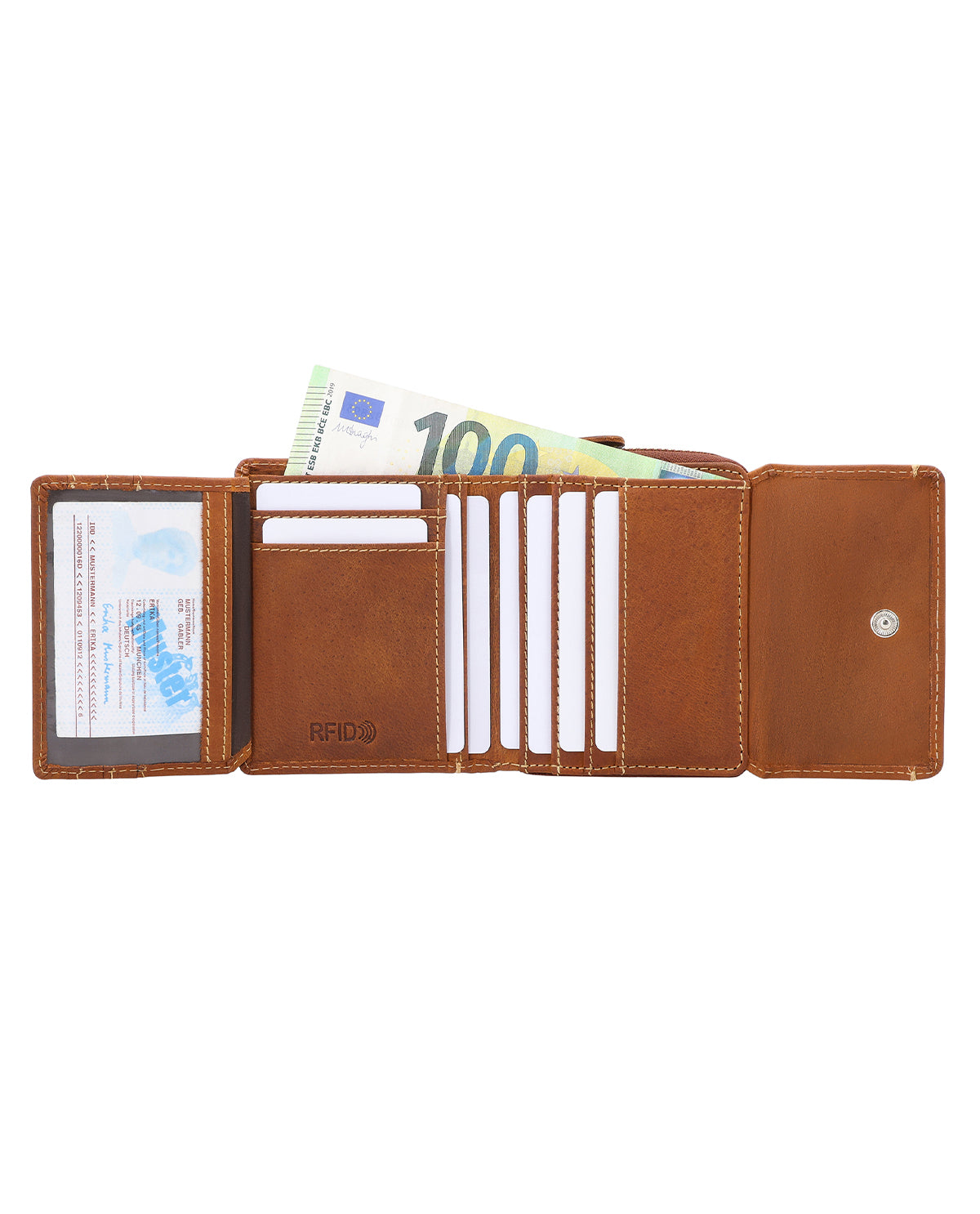 Inside, "Brigitta" has a bill compartment, a fold-out window, space for up to six cards, and a separate coin compartment with a zipper that prevents coins from falling out uncontrollably. Made of high-quality buffalo leather, the wallet closes securely with a snap fastener. So you're ready for the day at any time. The integrated RFID blocker in the wallet interferes with the signals from readers, protects your cards, and provides extra security.
