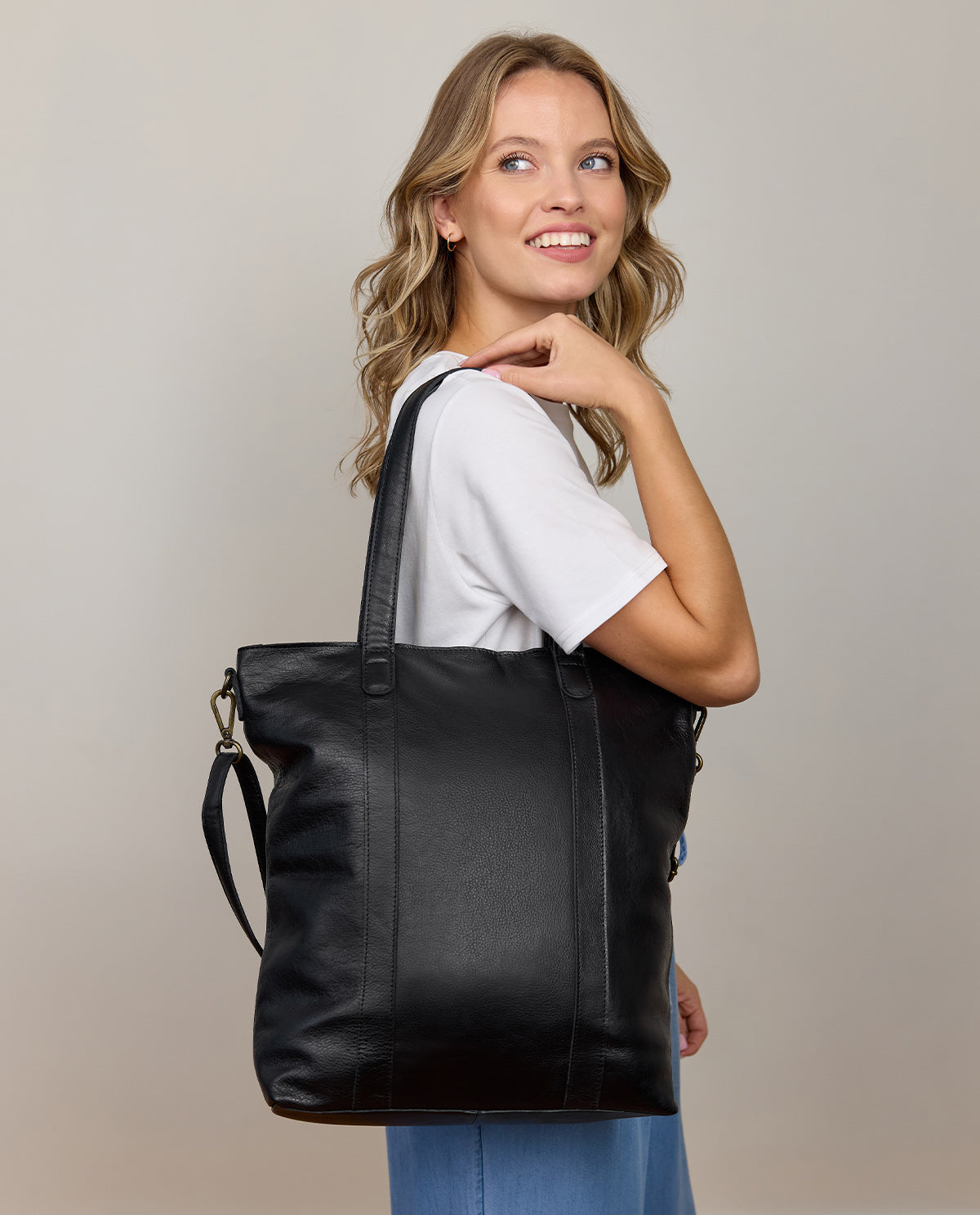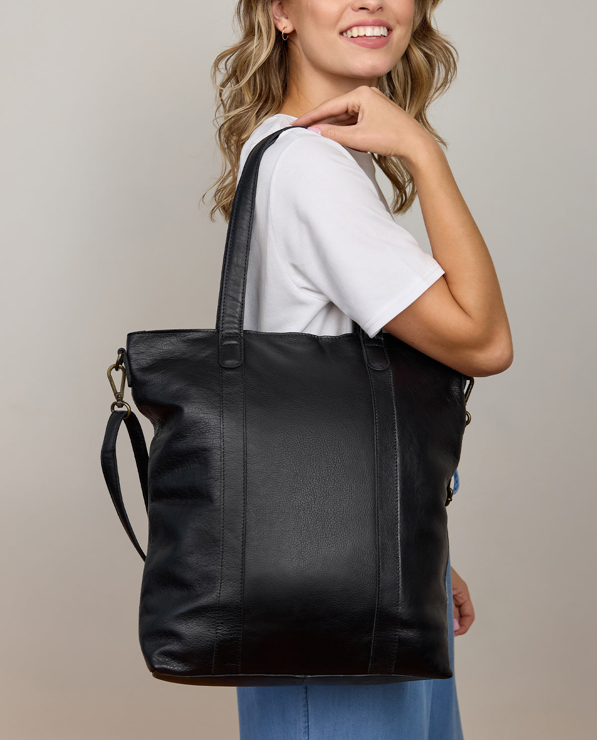 “Paris” might not look like the biggest bag, but she's actually super spacious! Who would have thought that a small laptop could fit into this compact tote bag? If you'd rather work from a café than at home, “Paris” is the perfect companion! You don't have to lug a bulky laptop bag around anymore; you can fit your laptop in your handbag. The soft buffalo leather gives this bag a cool vintage look, so you'll always look good when you're on the go! There are multiple small pockets inside where you can keep your belongings safe. Throw the long strap over your shoulder and off you go. Additionally, the long, detachable shoulder strap offers even more carrying comfort – perfect for wearing it comfortably over your shoulder or across your body, depending on your mood and preference! To top it off, “Paris” is available in elegant black or casual brown.