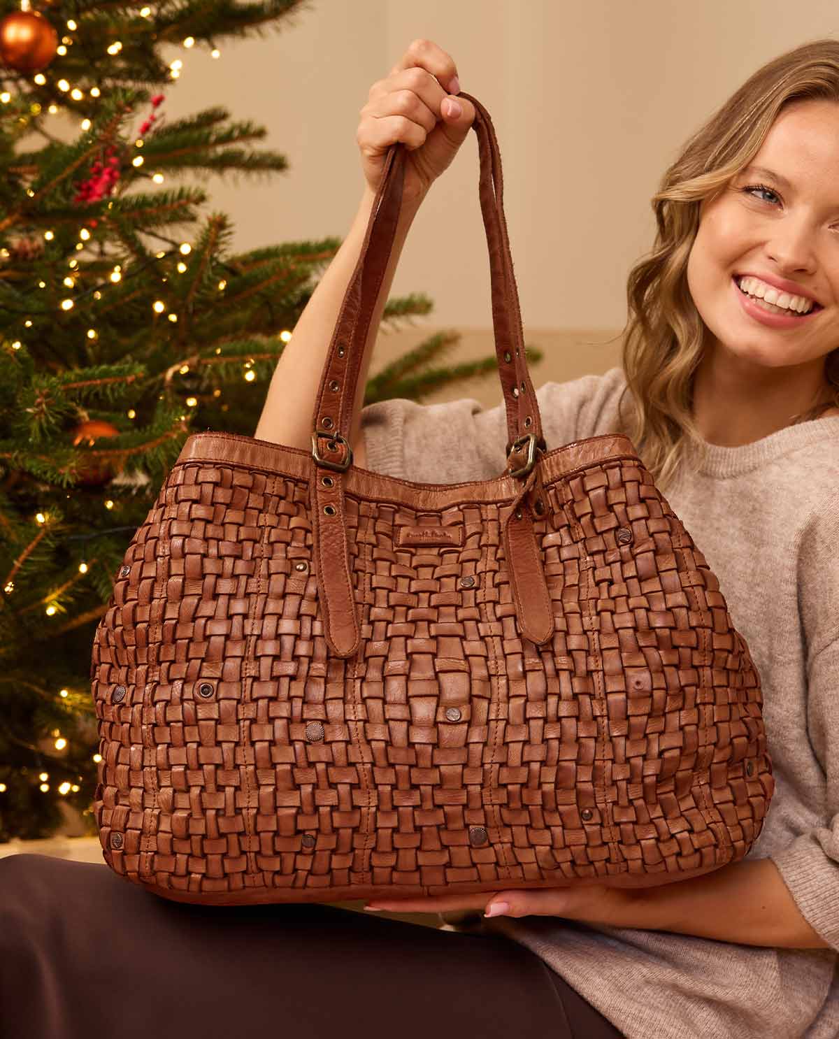 Our "Demery" is a stylish shoulder bag that turns heads wherever she goes with her woven design and elegant metal accents. This high-quality brown leather handbag has a unique vintage charm and will be a long-lasting companion. Use her as an elegant tote bag every day or a chic accessory for special occasions, "Demery" is the perfect companion for the modern woman.