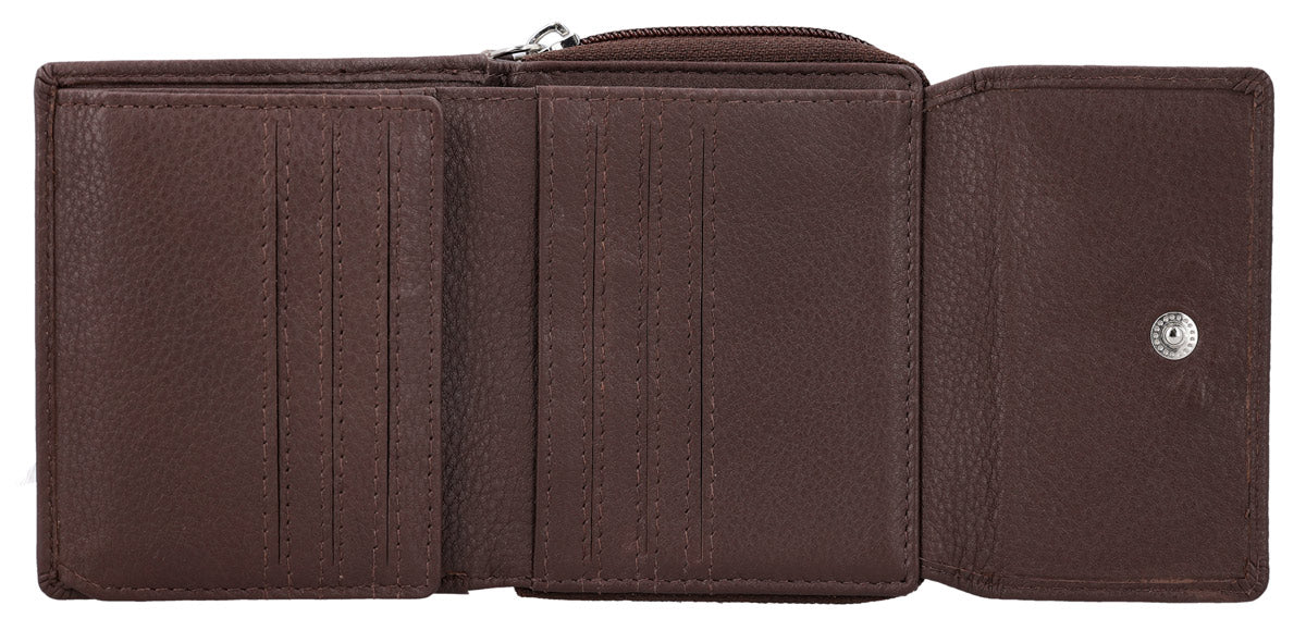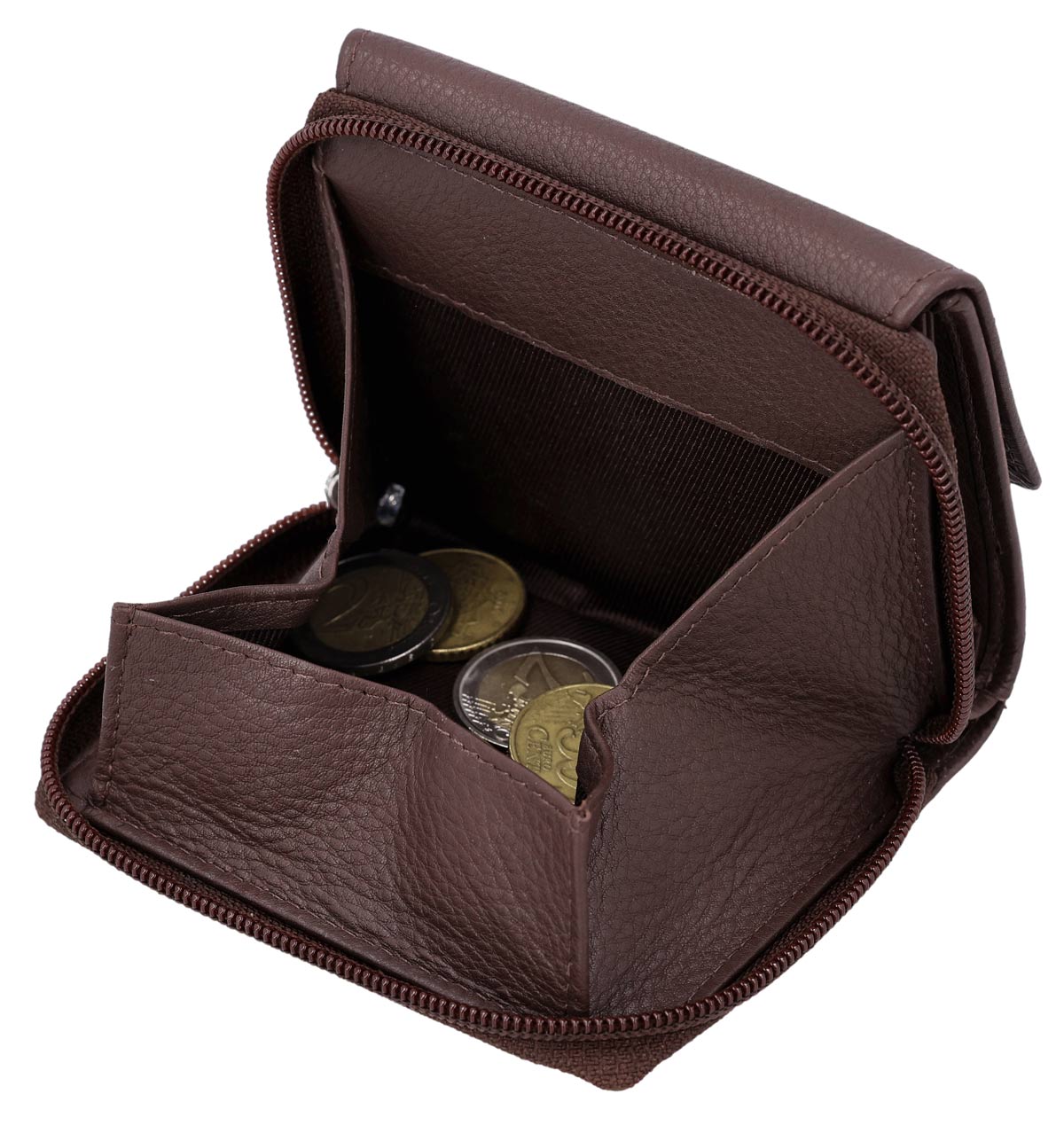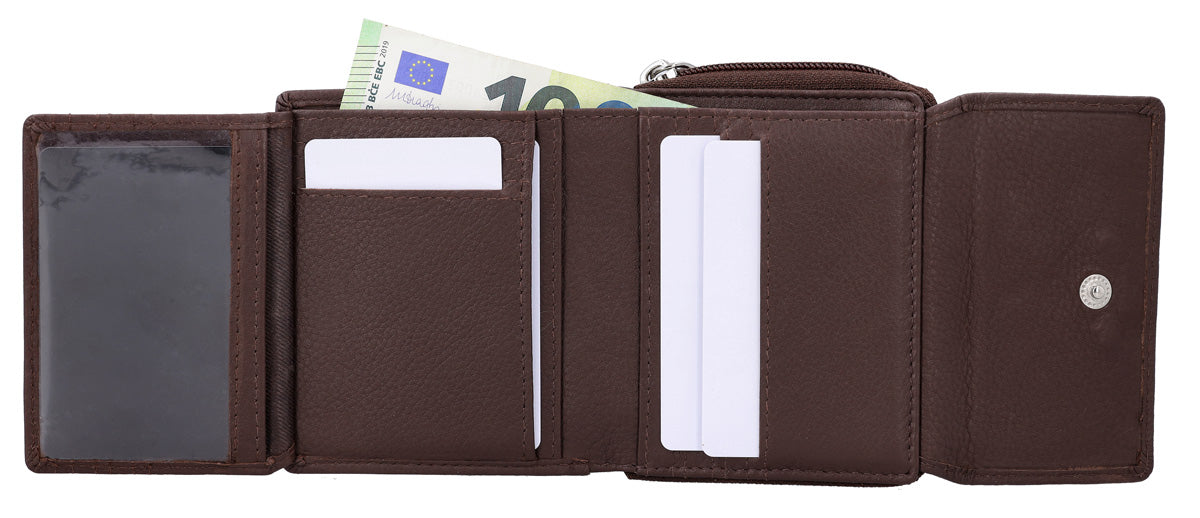Inside "Brigitta" you will find a bill compartment, a fold-out window, space for up to six cards, and a separate coin compartment with a zipper that reliably prevents coins from falling out. The snap closure made of high-quality leather keeps everything securely together. With the sewn-in RFID blocker, the signals from your cards are blocked, so unauthorized persons have no chance to read your data. A compact, stylish, and secure wallet for every day.