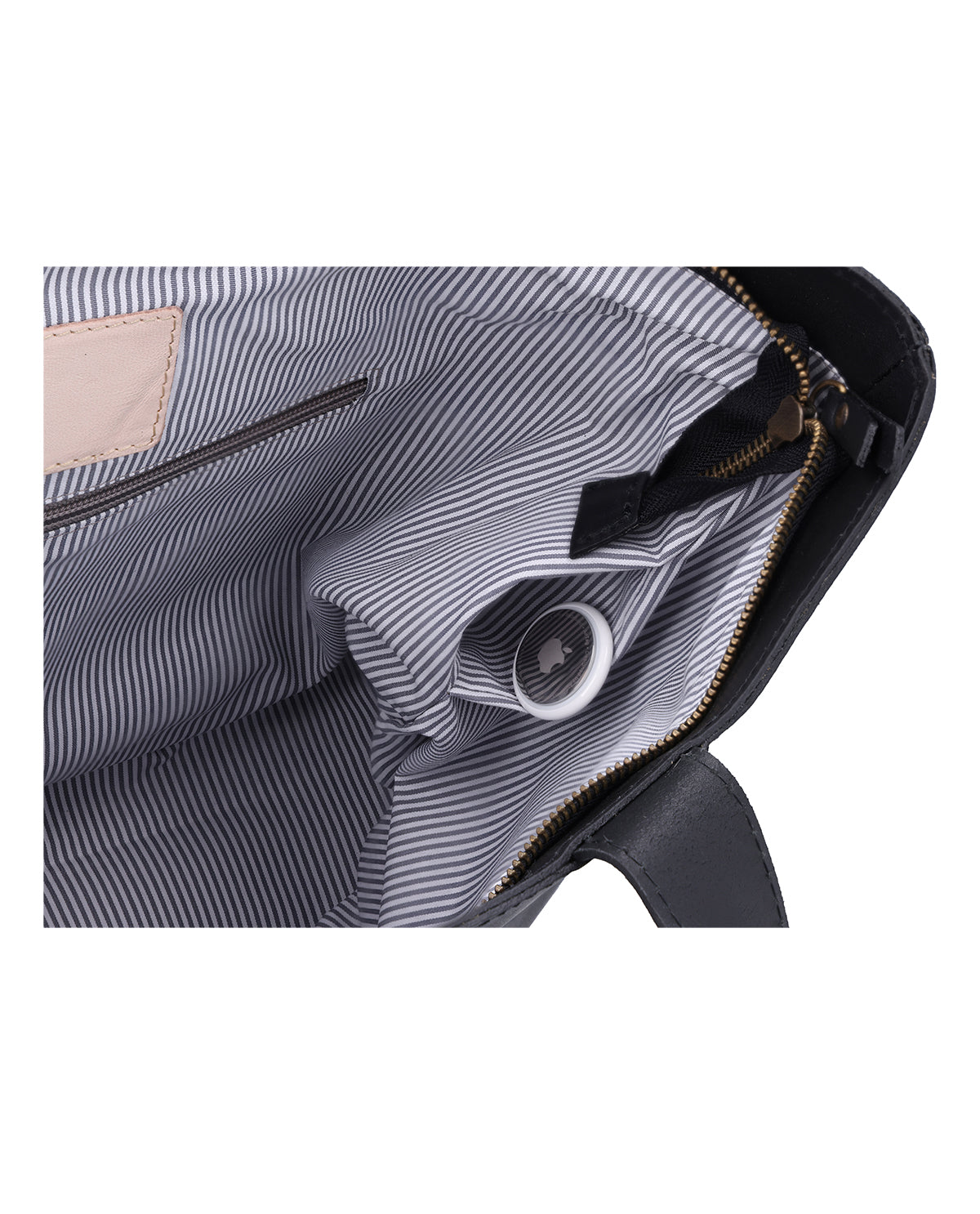 “Cecilia” isn't just chic on the outside, she's functional and well-thought-out on the inside too. There's an abundance of space inside this large shoulder bag. Her striped lining is a chic contrast to the luscious leather on the outside of the bag. You can open “Cecilia” up wide so you can see everything that's inside. No matter if you need to take your picnic blanket, A4 folders, or 15-inch laptop with you, there's plenty of space inside “Cecilia”. There are small side pockets for your phone, pens, and other smaller belongings as well as a zipped pocket for your purse. This tote bag has a sturdy zip that keeps your things safe and secure when you're on the go.