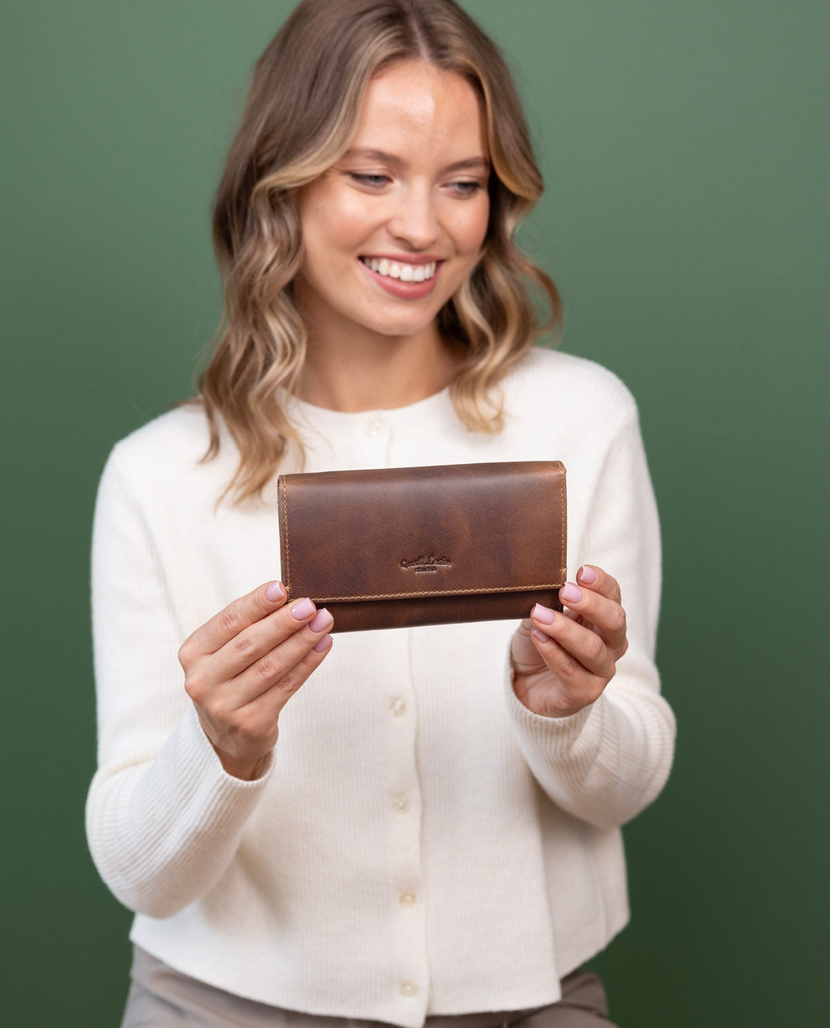 Cerchi un portafoglio elegante e funzionale che soddisfi tutte le tue esigenze? Ispirato a Berlino, il nostro portafoglio da donna in vera pelle marrone è il compagno perfetto per la tua vita quotidiana. Combina un design elegante con un'alta funzionalità.