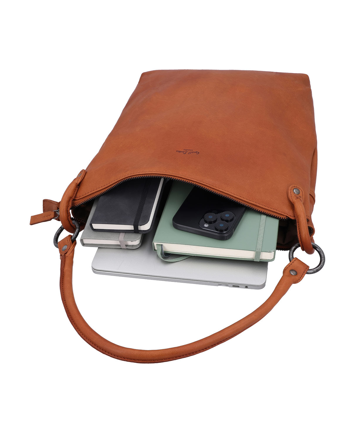 Il "Cathy" Shopper è la perfetta combinazione di funzionalità pratica e design elegante. Realizzato in pelle marrone di alta qualità, si distingue per i robusti manici rotondi, rinforzati da anelli metallici e dotati di dettagli in pelle cuciti a X. La cerniera con manico in pelle garantisce che i tuoi effetti personali siano sempre al sicuro e protetti. L'ampio scomparto interno, foderato con resistente tessuto di cotone, offre spazio sufficiente per tutto ciò di cui hai bisogno nella vita quotidiana.